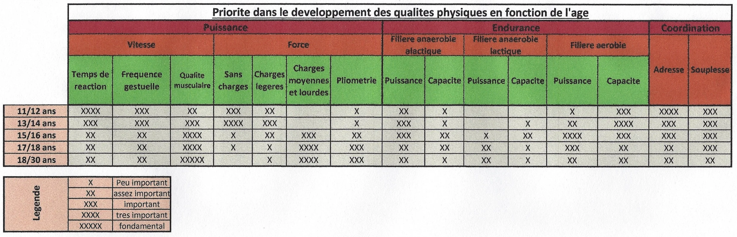 Voici les priorités à suivre dans le développement des qualités physiques en fonction de l'âge. C'est à partir de ce tableau que j'ai commencé à réfléchir à mes entrainements.